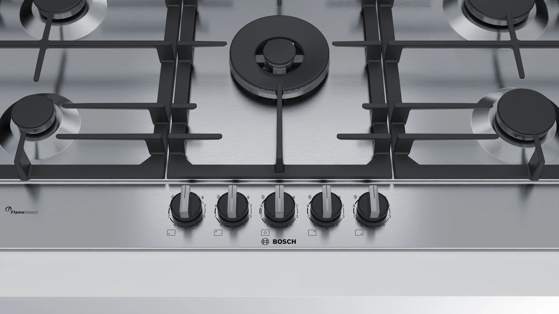 Cubierta de gas Bosch Serie 6 de 90 cm en acero inoxidable con 5 quemadores FlameSelect, parrillas de hierro fundido y diseño premium.