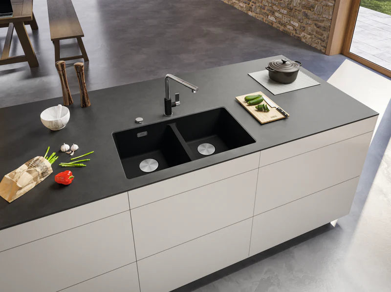 Descubre la poceta sintética doble tina Maris en elegante negro mate, una opción perfecta para modernizar tu cocina. Fabricada con fraganite, una mezcla de 80% arena de cuarzo y 20% resinas acrílicas, esta poceta ofrece una resistencia excepcional a altas temperaturas, rayones y hongos